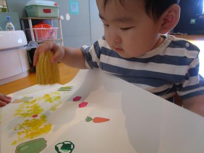 製作で野菜スタンプを行いました!トウモロコシを自分で上手に持ちトントン紙に