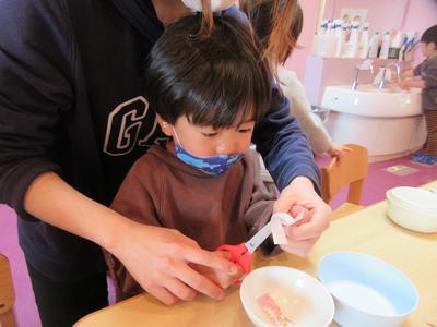 いざ、はさみを使う工程になると、保育者と1対1で真剣に切ることが出来ました。