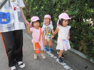 お友達と手をつないでお散歩へ♪車が来たら端によって止まって待つよ!