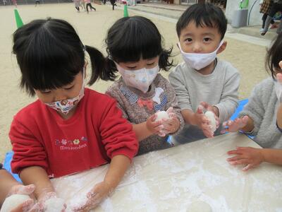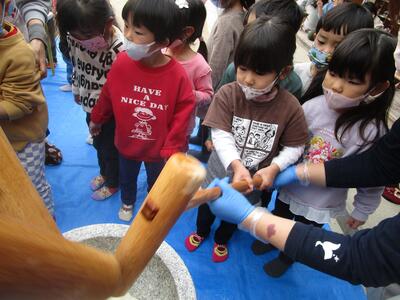 お餅付き会では、杵を先生達と一緒に持ちぺったんぺったんとしました!